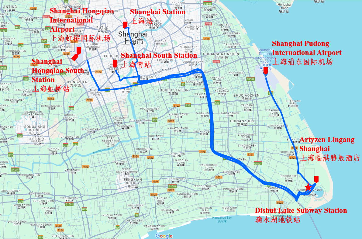 to Longyang Road Station - Subway Line 16- Exit from Dishuihu Station - Walk